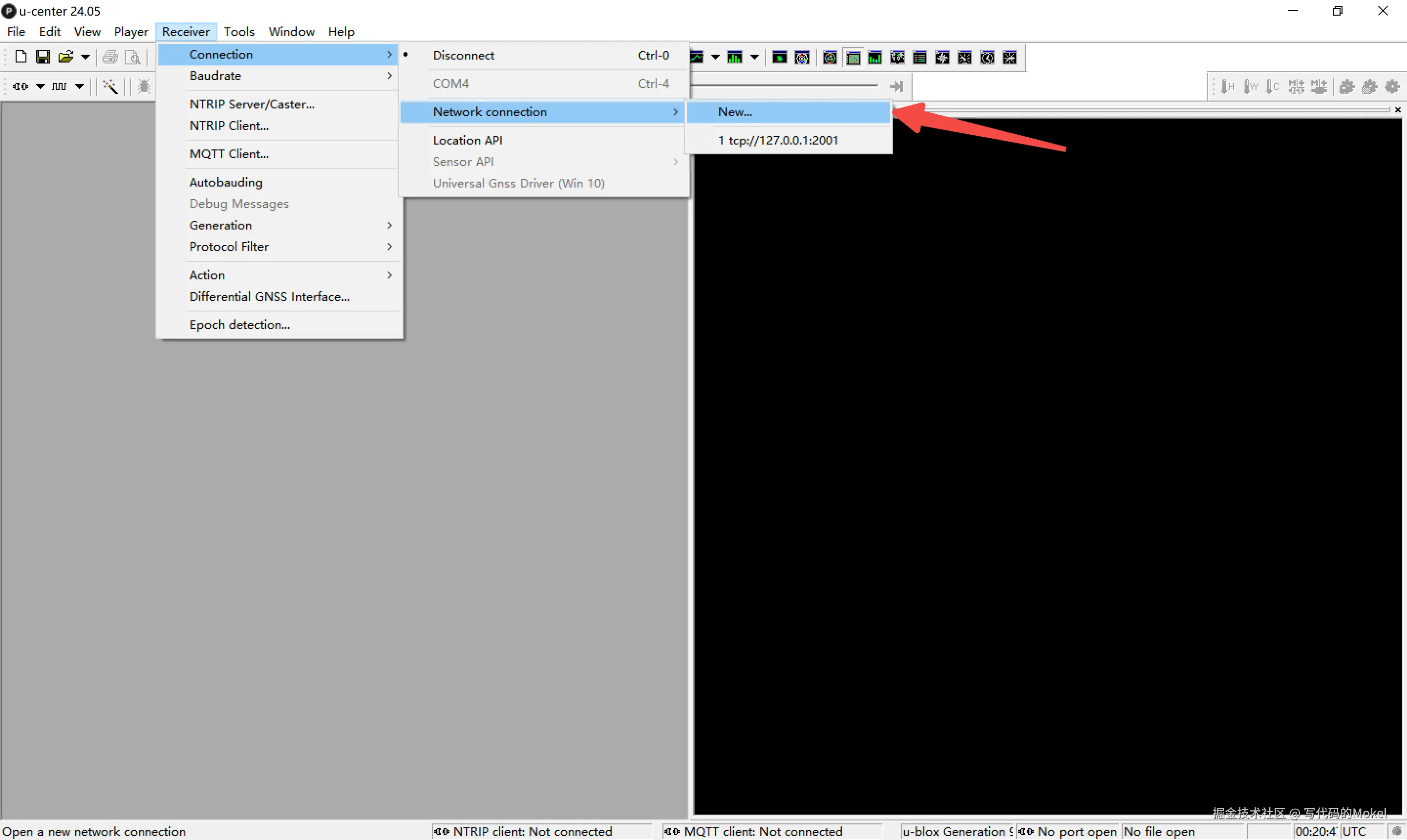 在u-center主界面的左上角点击 Receiver -> Connection -> Network Connection -> New...,在弹出的输入框里输入TCP Server的地址(Address):tcp://127.0.0.1:2001,点击OK建立连接。当你已经创建过Connection之后,你就可以在直接点击 Receiver -> Connection -> Network Connection -> 1 tcp://127.0.0.1:2001 与 TCP Server 建立连接。