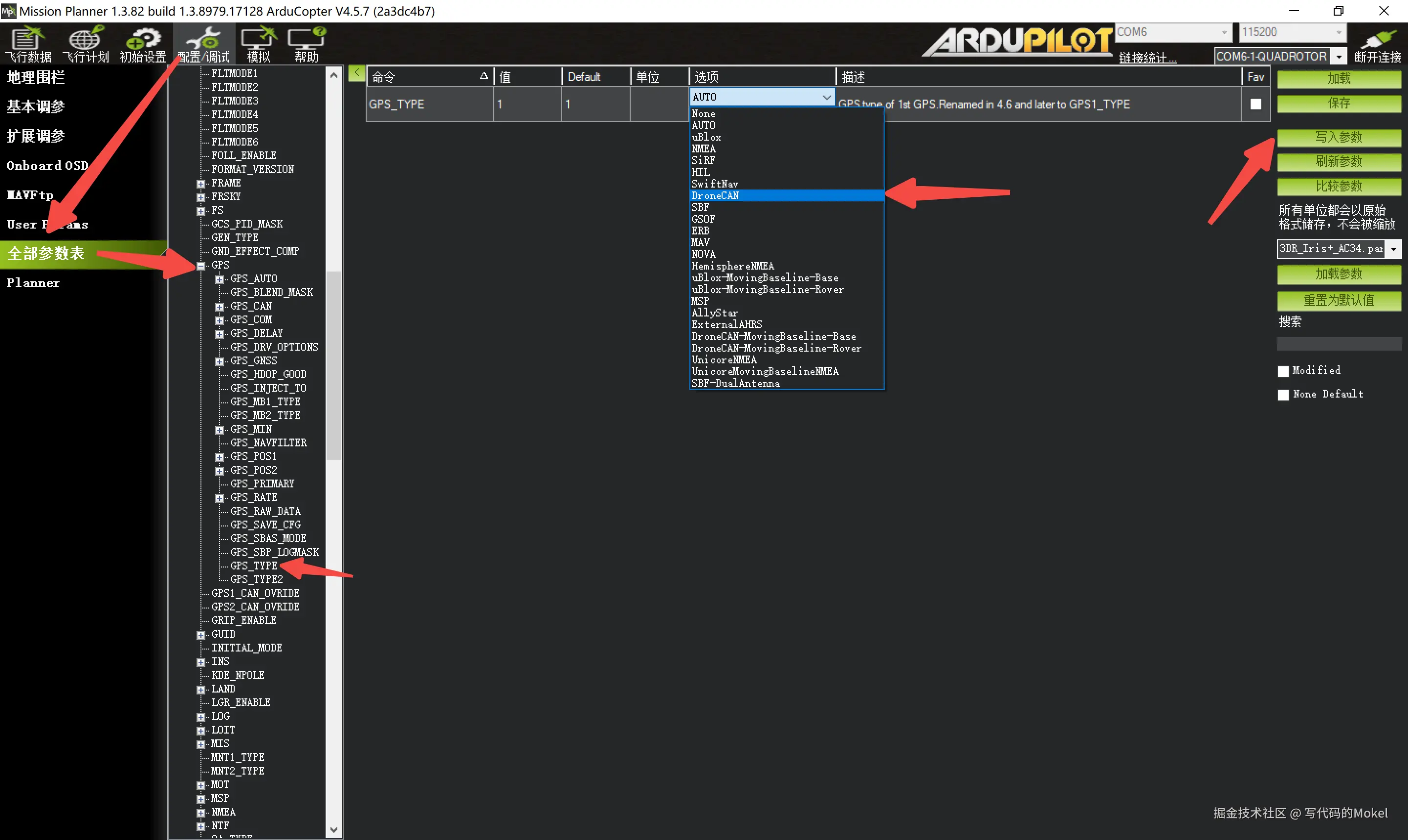 目前(截至该文章发布之日即2024年11月),Ardupilot飞控固件的GPS参数还不是默认开启对DroneCAN GNSS的支持,所以我们切换到 配置/调试 -> 全部参数表 -> GPS参数组 -> GPS TYPE参数,将其从默认值1(AUTO)修改为 9(DroneCAN),然后点击右侧的写入参数,再对飞控断电-上电重启后重新连接到Mission Planner。
