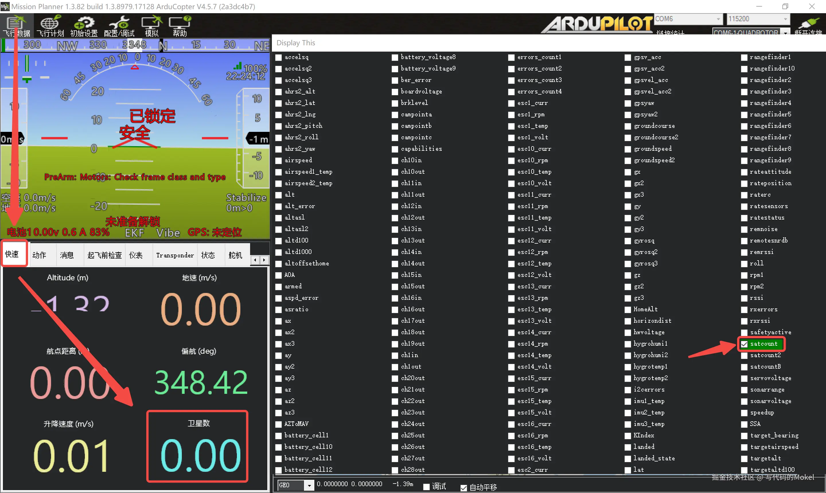 切换到飞行数据界面,如果你的页面此处并未显示 卫星数 指标,那么你可以双击此处,在弹出的 Display This 对话框里勾选 satcount 指标,对话框会自动关闭并且此处变更为显示你选择的 卫星数 指标,如果对话框没有自动关闭,你可以点击对话框右上角的 x 关闭该对话框。