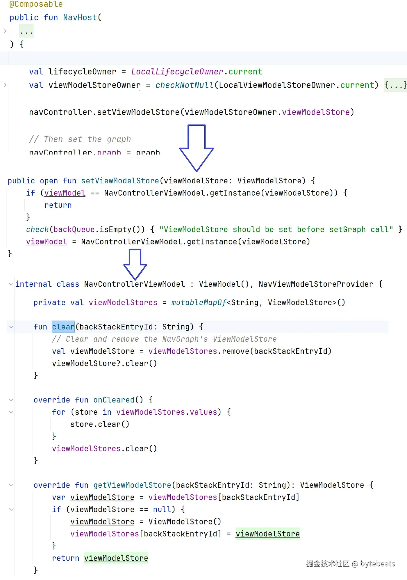 我想知道他们是如何从 Jetpack 导航库中做到这一点的? 他们是如何在从一个目的地导航到另一个目的地时保持状态的? 答案很简单: 他们使用... ViewModel! 没错! 他们在自己内部的 NavHost 的 ViewModel 内有一个 ViewModelStore. 因此, 基本上, 导航图谱中的任何 ViewModel 都存储在另一个 ViewModel 中, 而导航组件足够聪明, 可以跟踪所有这些 ViewModel, 正如你在以下内部代码 Fragment 中看到的那样: