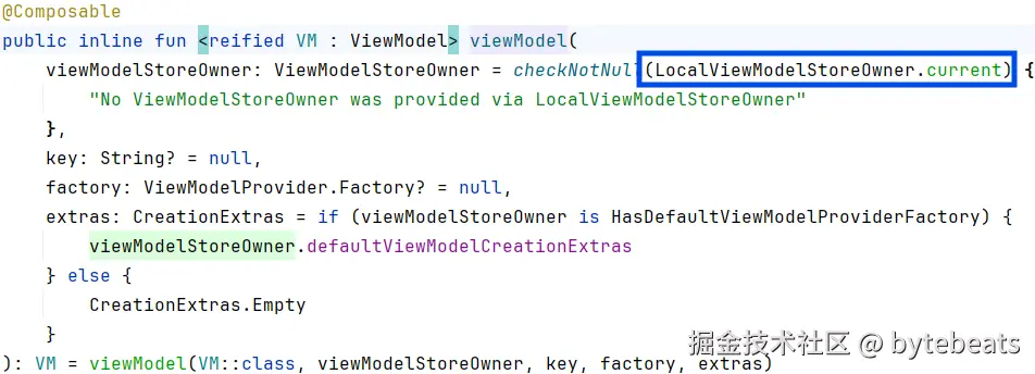 现在, 如果我们以最简单的方式注入 ViewModel, 我们可以看到在 viewModel(..) 辅助函数中, 我们为 ViewModelStoreOwner 参数设置了一个默认值: LocalViewModelStoreOwner: