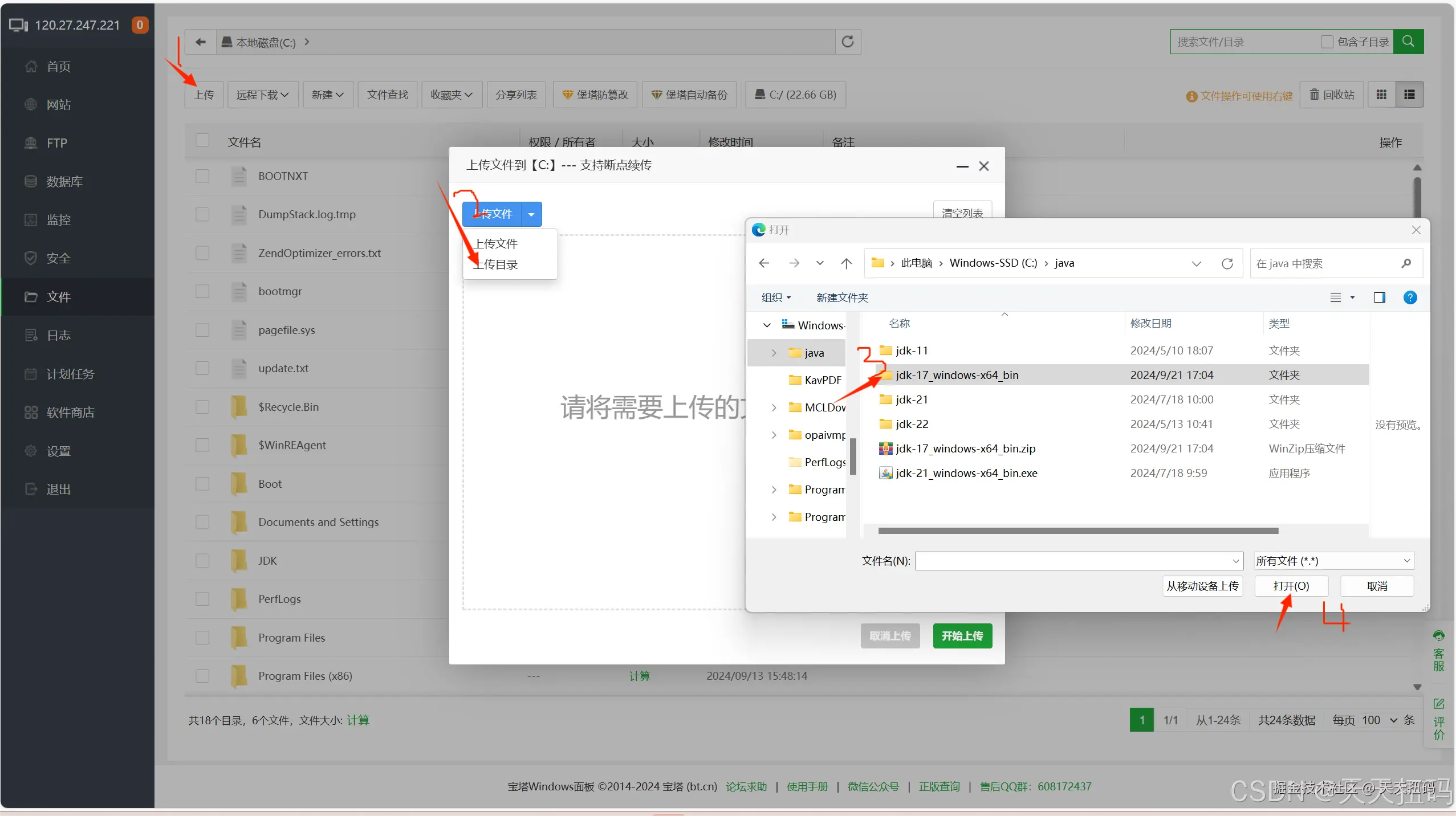宝塔上只能下载jdk1.8或以下,但是我们的版本是jdk17,所以我们要在本地上传jdk17