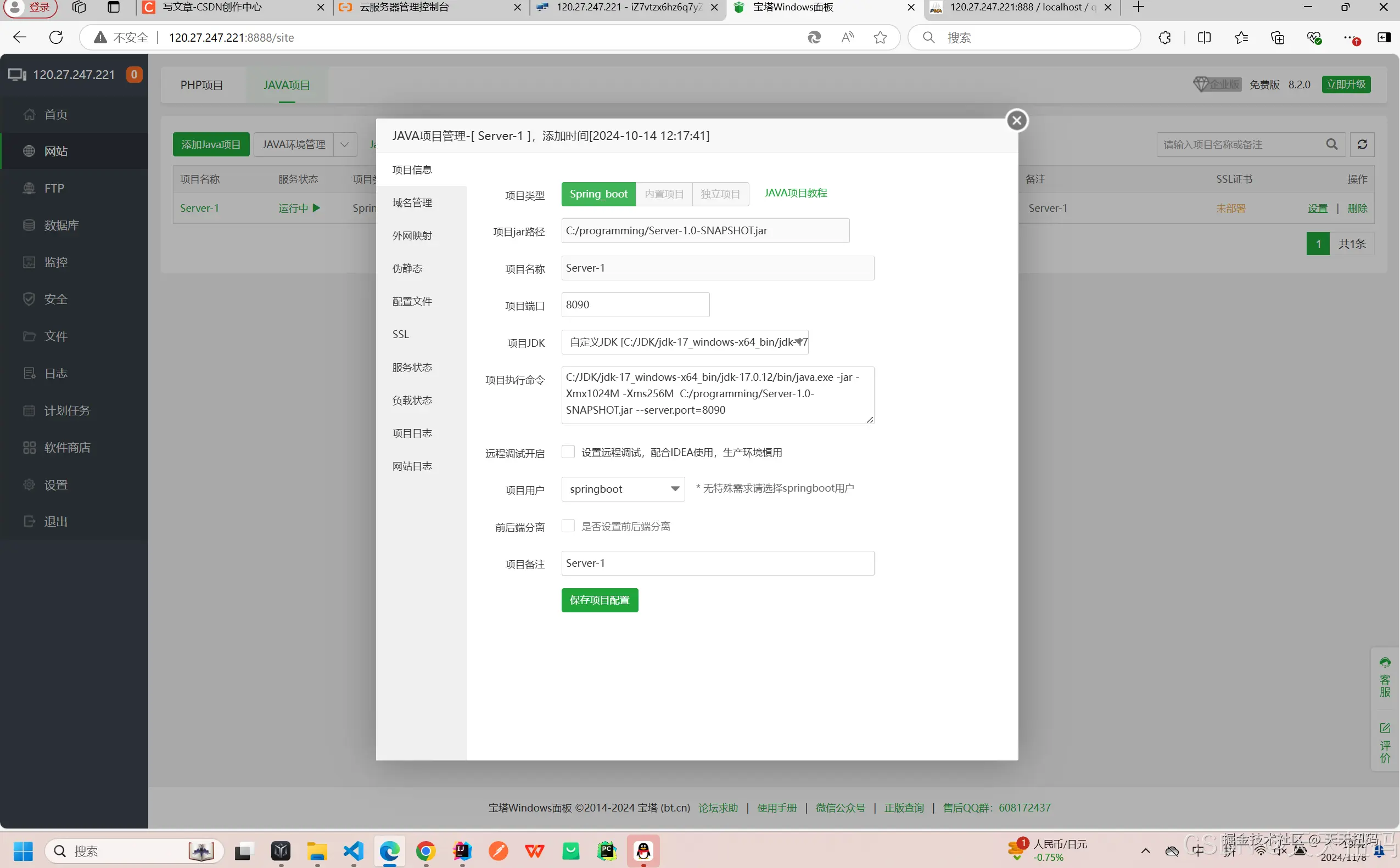 点击添加Java项目,按照如下配置即可,注意项目的jar路径要是你的jar包的路径,而且配置文件要和jar包的位置同级,端口要是没有被占用的端口