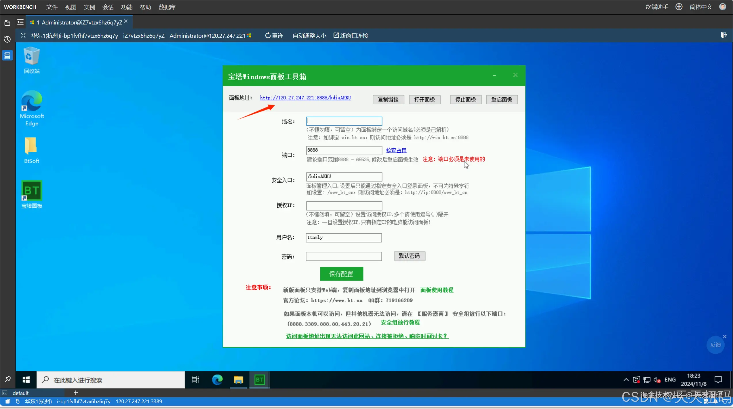 9.设置好之后在自己的电脑浏览器打开面板地址(是在自己的浏览器不是云服务器中噢)