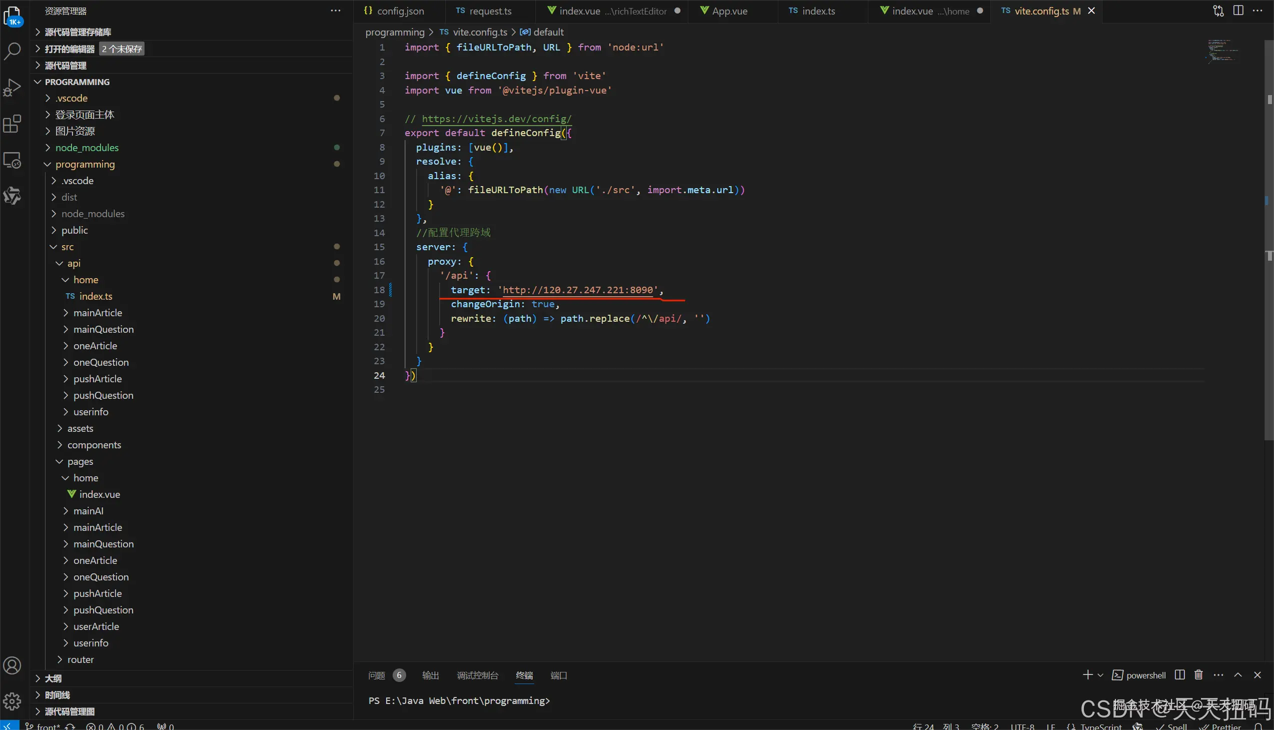 这一部分来解决连后端跨域配置的问题,相信很多小伙伴有一个问题,前端是如何找到后端接口的,为什么前端用的“/user”是自己电脑上的后端项目规定的“/user”,如果小编电脑上正好也定义了一个“/user”呢,为什么不会调用小编电脑上的“/user”接口。其实如果在前后端项目上如果不做配置,就是你后端写了一个“/user”,前端想用也是找不到“/user”的,那么怎么可以让彼此找到呢?我们只需要做一些小小的配置即可