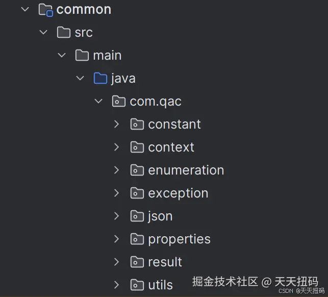 common模块负责管理在整个项目都可以使用到的方法等,如utils就可能放置一些jwt工具,oss工具之类的,exception中放置处理异常的方法,json中放置json转换器等