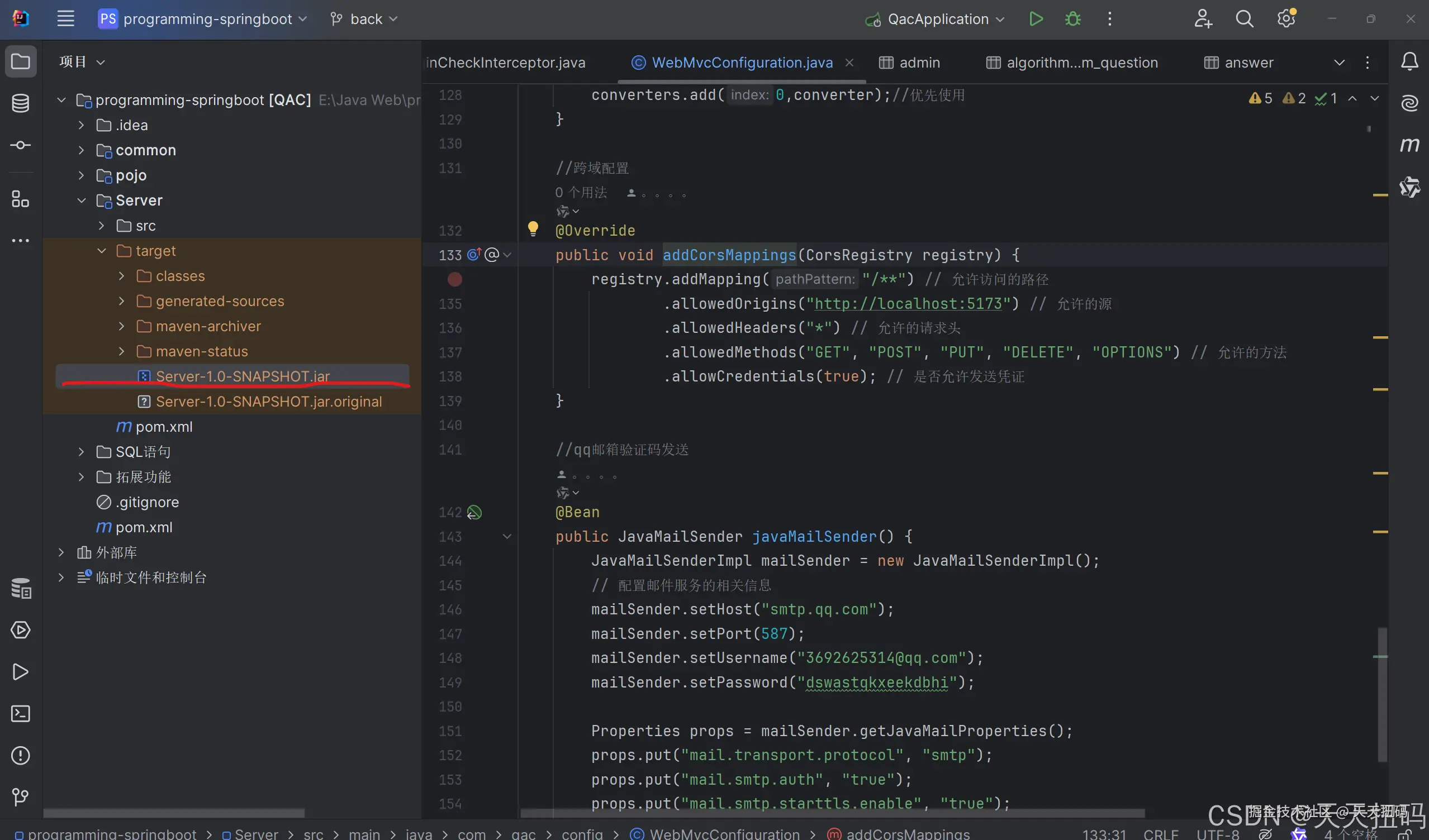 这是有关跨域的一部分配置,允许了"http://localhost:5173"的连接,而"http://localhost:5173"正是本地前端的运行端口