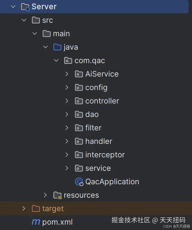 server模块负责管理一些具体的业务逻辑,比如登录功能,发表文章功能等,这里需要特殊说明的是“controller、service、dao”三层架构,是后端项目常用的项目结构,controller层负责规定方法请求的url,service层负责处理方法的具体逻辑,比如信息校验之类的,dao层负责依据方法的需求处理数据库,这三层架构层层递进,是springboot项目的核心