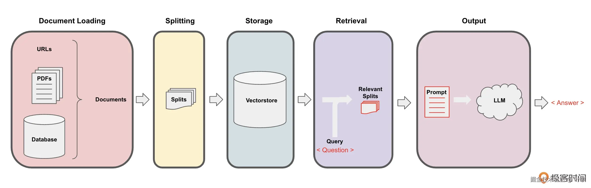 - Output:把问题和相似的嵌入片传递给语言模型(LLM),使用包含问题和检索到的分割的提示生成答案。