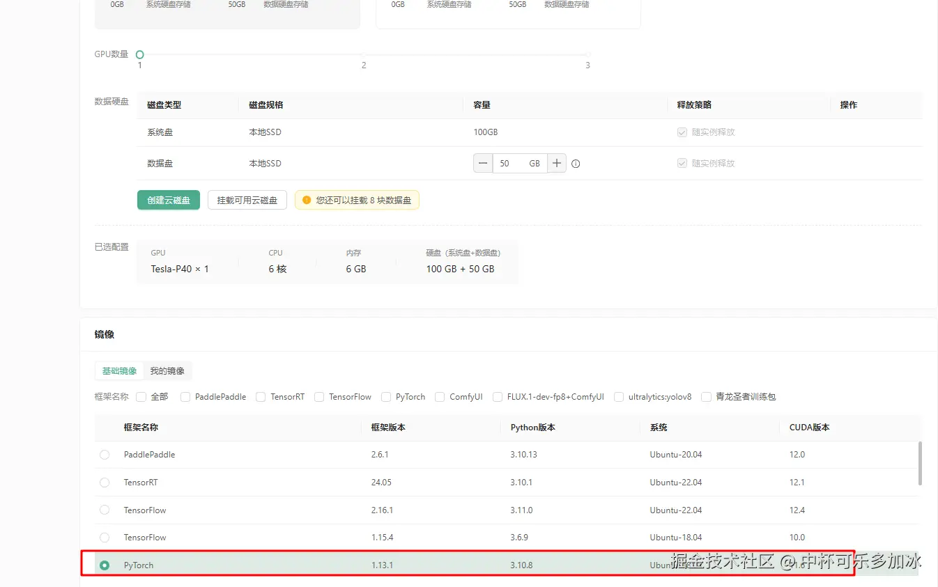 数据硬盘上可以选择默认的50GB,镜像上可以直接选择PyTorch1.13.1、Python3.10.8、CUDA11.6版本: