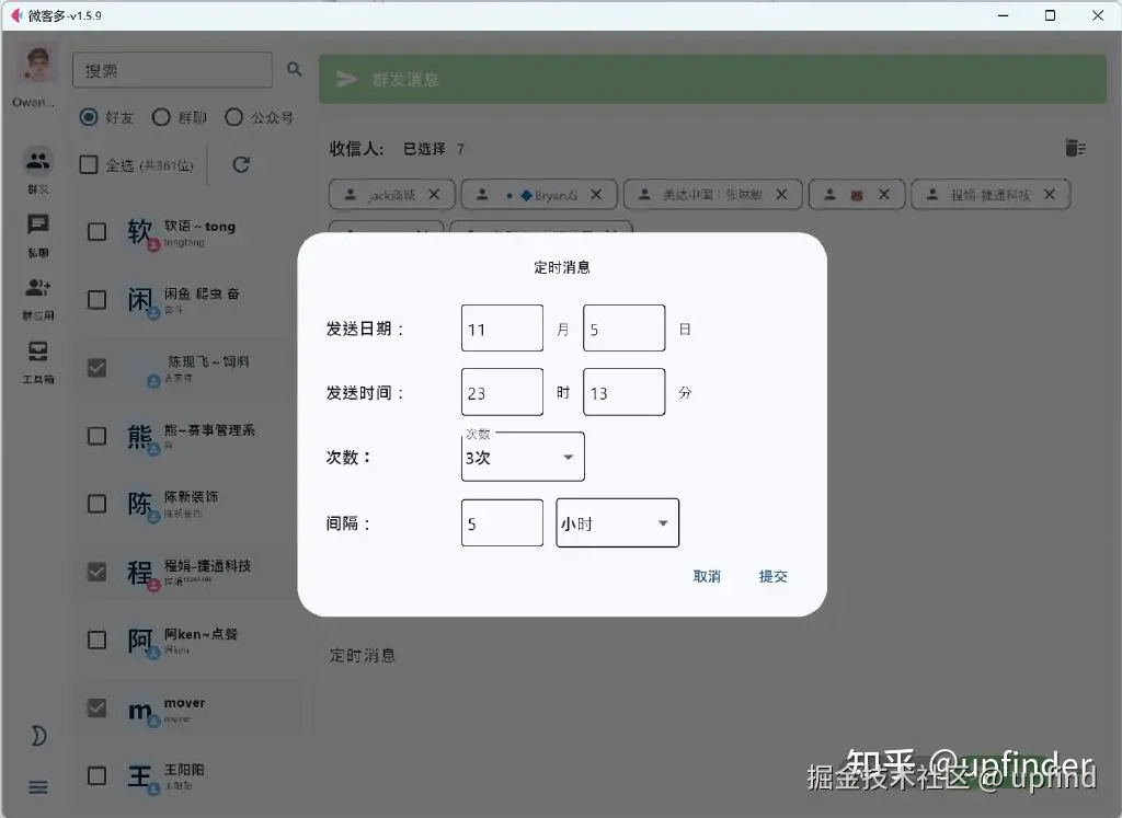 除了支持消息群发之外,同时可以在发送消息时选择定时发送,定时消息可以选择首次发送时间,同时还支持设置循环发送次数,以及循环间隔时间等,适应更多实用场景