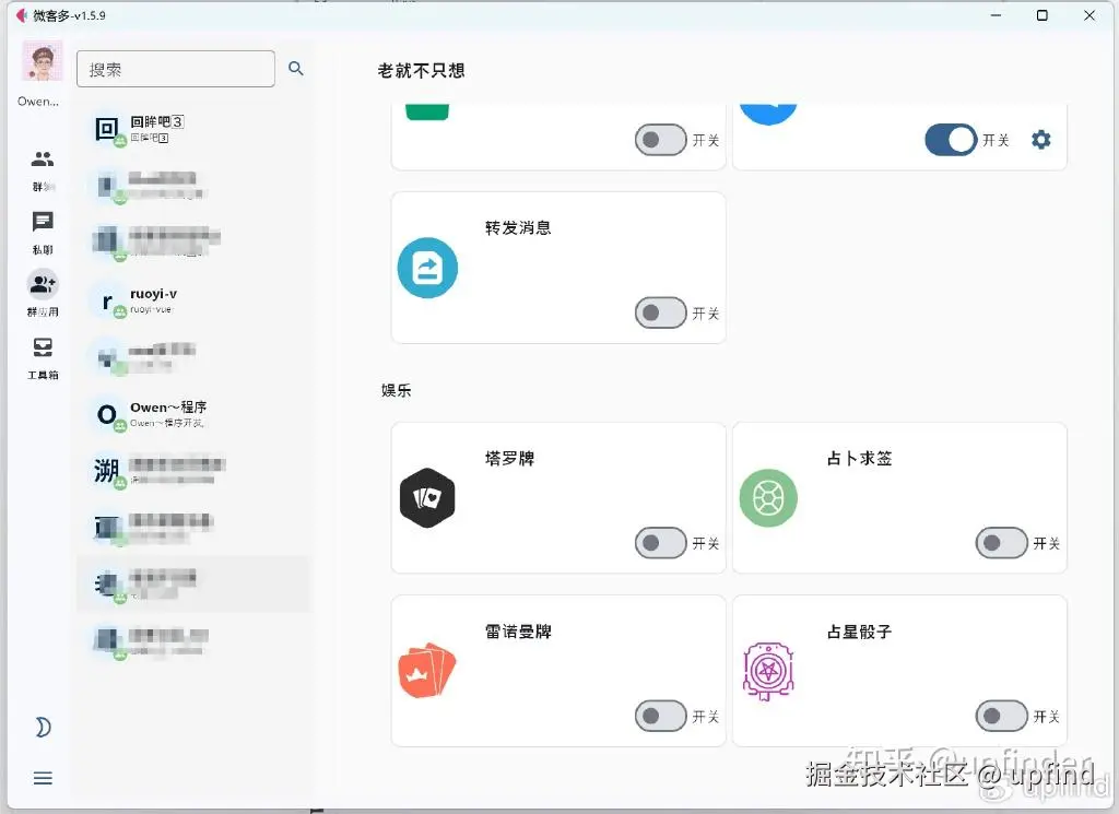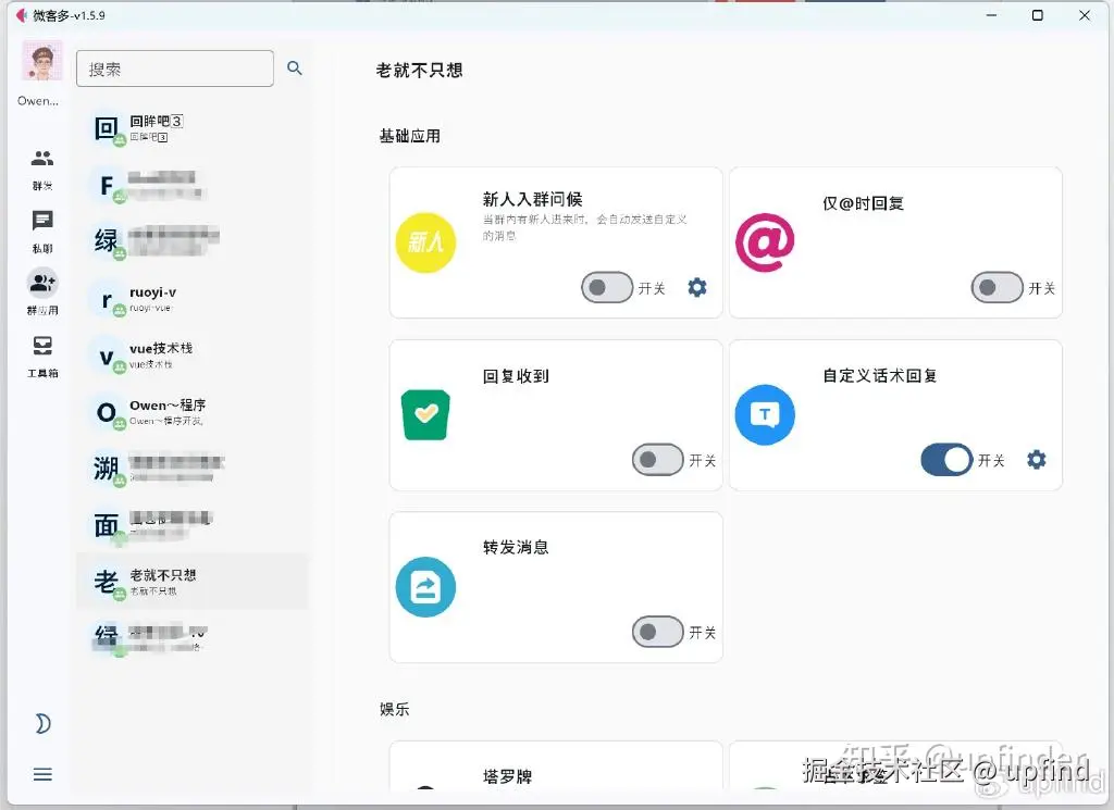 群聊应用模块主要针对群聊场景开发的应用列表,主要分为两大类型 基础应用 、娱乐应用 ; 选择特定的群后,可以同时开启多个群应用,并对应用进行参数配置,以满足你的自动化运营
