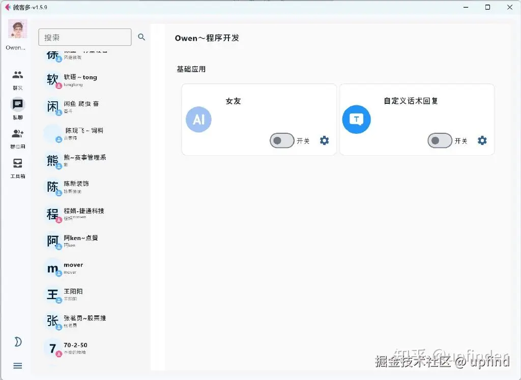 私聊应用模块中主要是针对私聊场景开发的应用,例如AI回复,自定义回复;支持选择不同的好友进行个性化的应用设置,例如对张三开启 AI回复;对李四开启自定义回复。每个人还可以设置不同的自定义回复规则。实现千人千面的AI角色