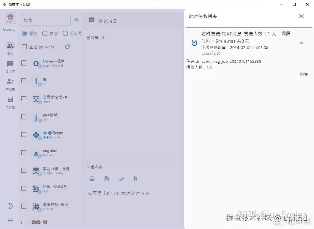 - 点击发送按钮后,消息便会群发给你选中的好友,特别提醒,也可以通过发送按钮右侧的小三角按钮,选择定时发送,使用定时消息功能