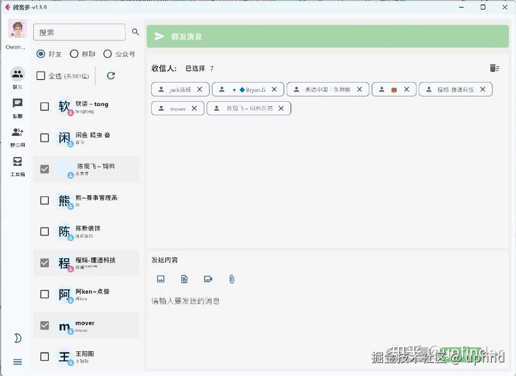 - 左侧加载出来 好友列表后,可以勾选多个好友,勾选的好友会进入右侧收件人模块,你也可以在收件人模块取消掉勾选