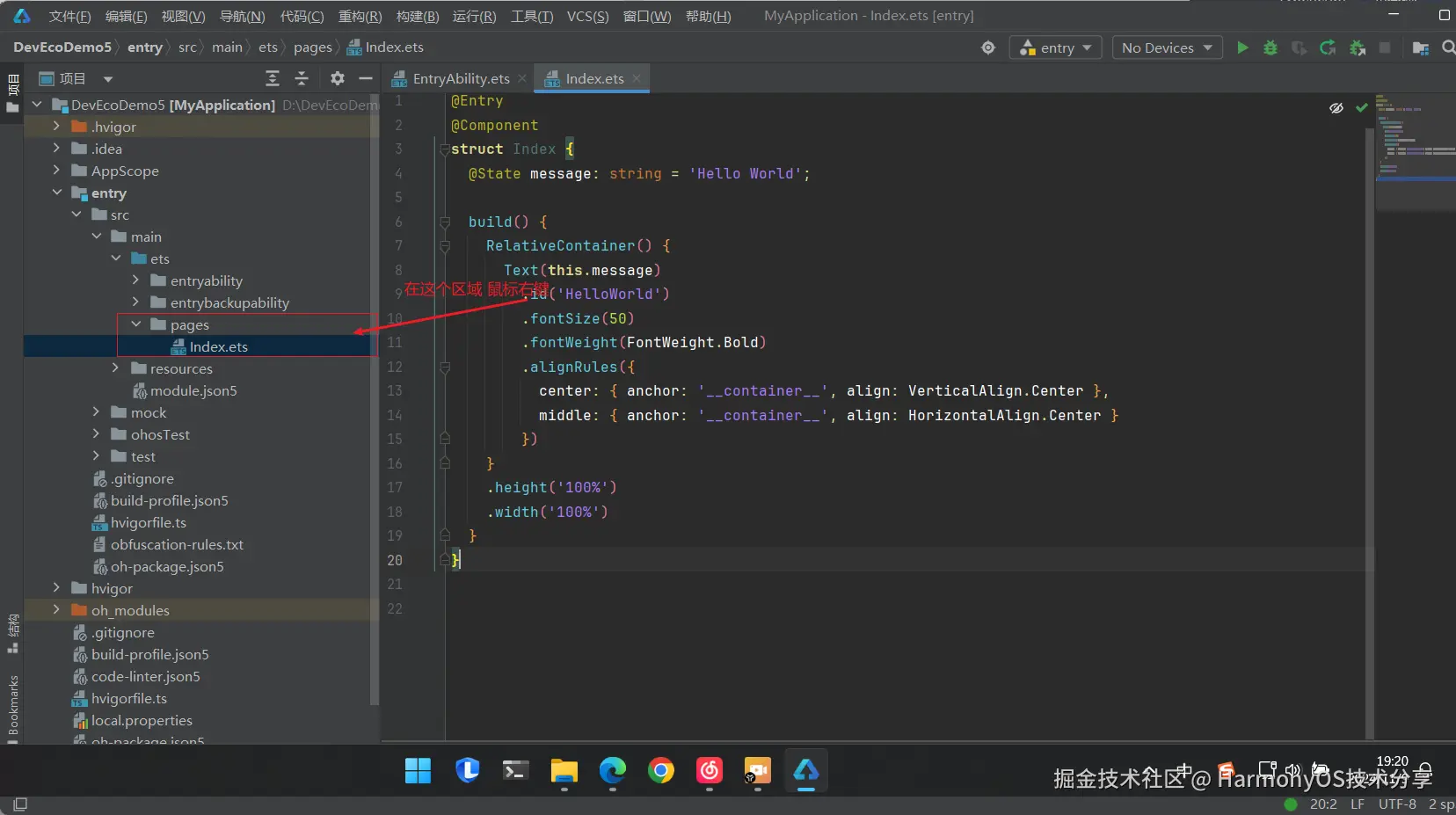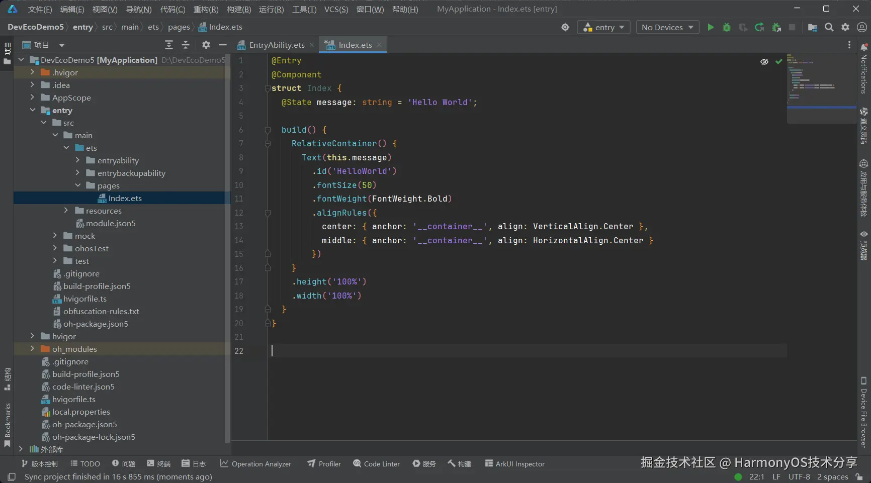 在初阶,第一次创建项目,可以看到Index.ets 默认写的代码,会看不懂,不过没关系
