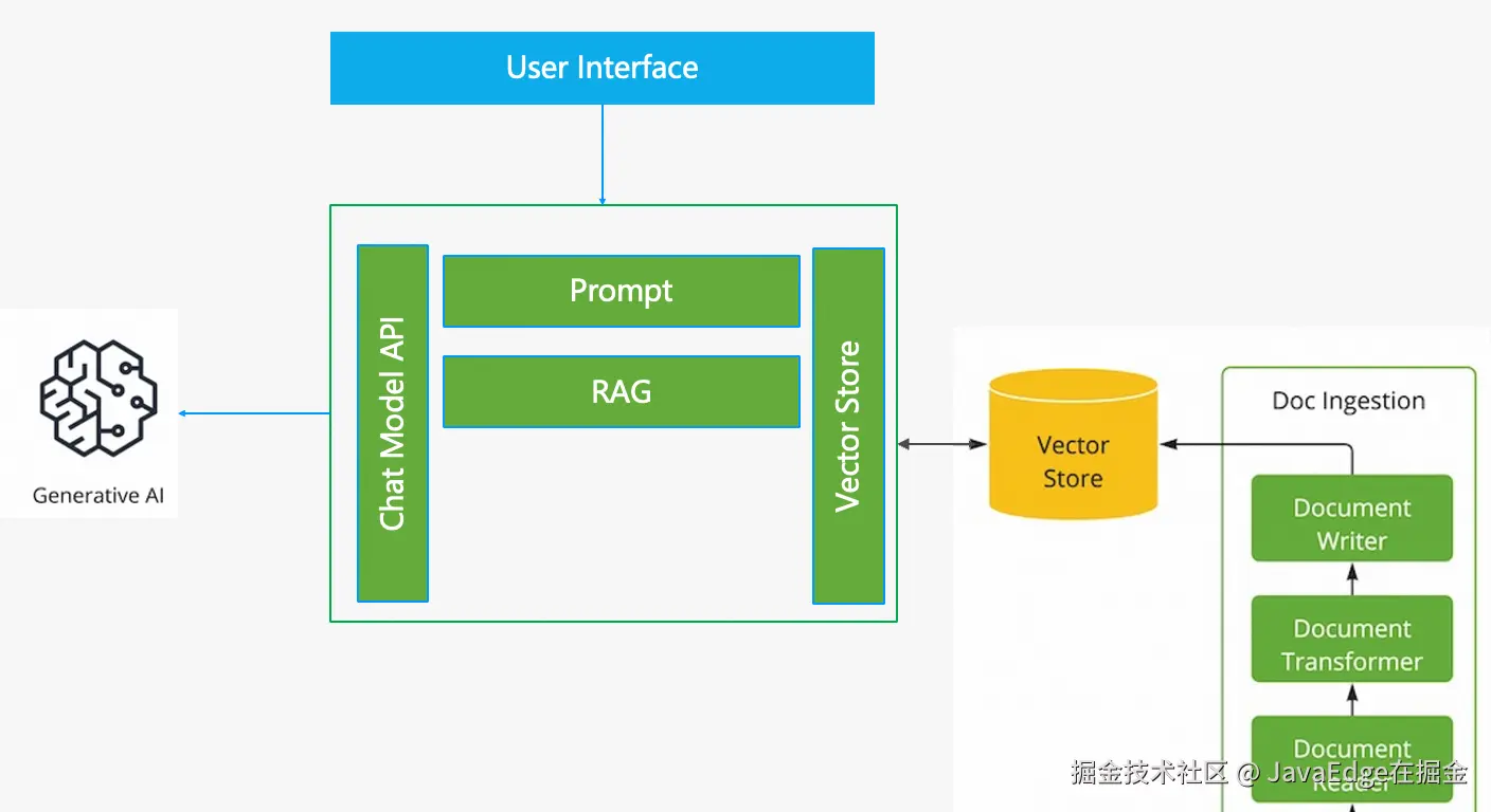 不过是用 Spring Boot 开发普通 Java 应用,要能持续接收用户提问,解决机票相关问题,叫它Agent应用是因为这应用可与 AI 交互,由 AI 帮助应用理解用户问题并为用户做决策,简化分解后的架构: