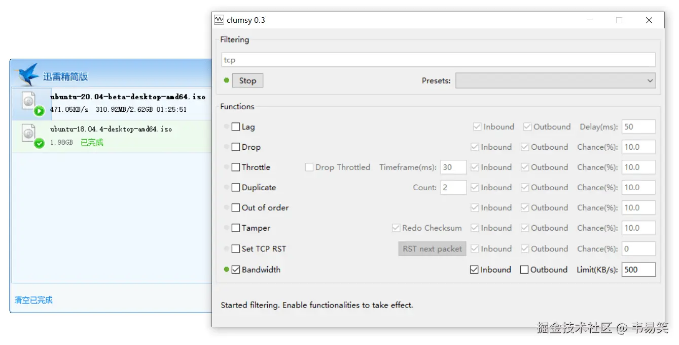 唯一问题是不支持模拟带宽,那么平时要模拟一些糟糕的网络情况的话,是不太方便的,而开虚拟机用 Linux tc 或者设置个远程 linux 网关又很蛋疼,于是我顺便给他加了个带宽模拟功能: