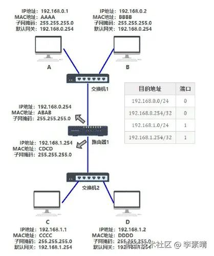 因此需要A在知道D和自己不在同一个二层网络时,将接收方MAC地址写为路由器在自己所属的二层网络中的MAC地址,由路由器转发到其他的二层网络。