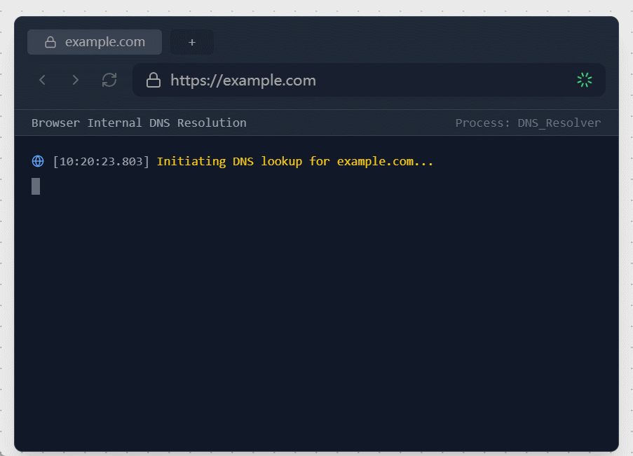 当你在浏览器的地址栏中输入一个 URL 并按下回车键时,渲染过程就开始了。假设我们正在尝试加载 “example.com” 。浏览器不知道从哪里获取这个网站的内容。这只是一个我们人类能够理解的名称,浏览器理解不了——它需要将这个名称转换为一个 IP 地址——这就是 DNS 查找发挥作用的地方了。