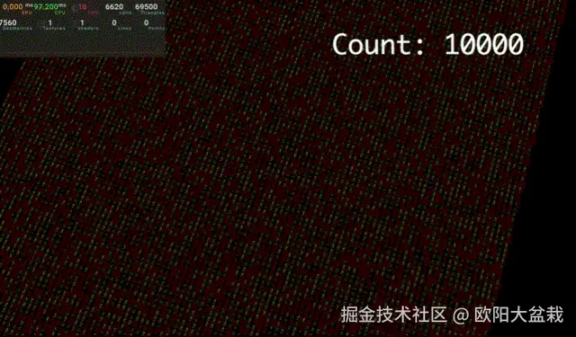 关注上面的图片,当数量到到 10K 的时候,FPS已经20 以下, 整体操作非常卡顿。可以看到 calls的数量在 6K+ 也就是我们画面中能看到的文本数。而面数到了 60K, 说明 Text这个组件一个大概会有 10 个面。这个数量有点超乎我的预料。 在WebGL中,绘制调用(draw call)是指发起绘制操作的过程,在WebGL中,常用的绘制函数是 gl.drawArrays() 和 gl.drawElements()。这将会把所有设置好的数据传递给GPU,开始执行渲染。调用draw call 相关因素