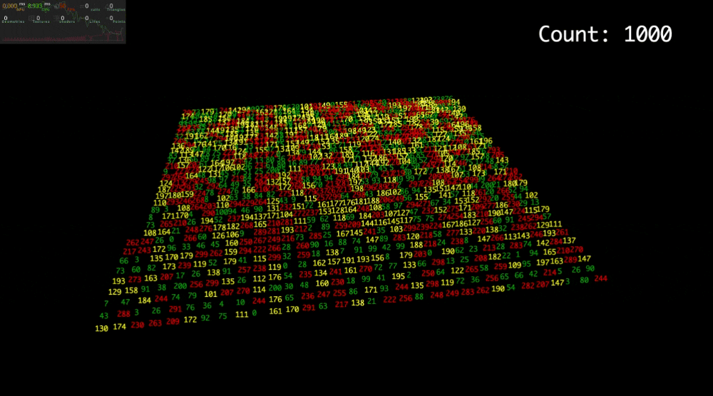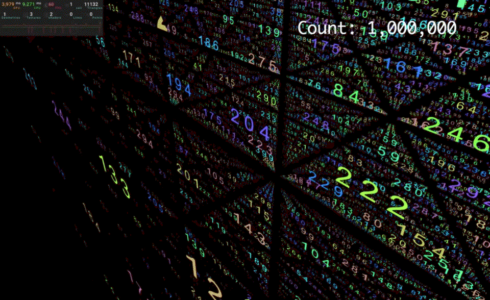 一样是使用 r3f. 这里我们直接上 1 百万的文字,由于文字数量太多了,为了尽量能渲染到,我们这次使用了立方体摆放位置, 我使用了 planeGeometry 也就是一个指标会用到两个面。 经测试最个画面中到了 20w的指标还是能保持在 60fps以上。 由于我的电脑还开了很多其他东西,实际效果肯定更好。