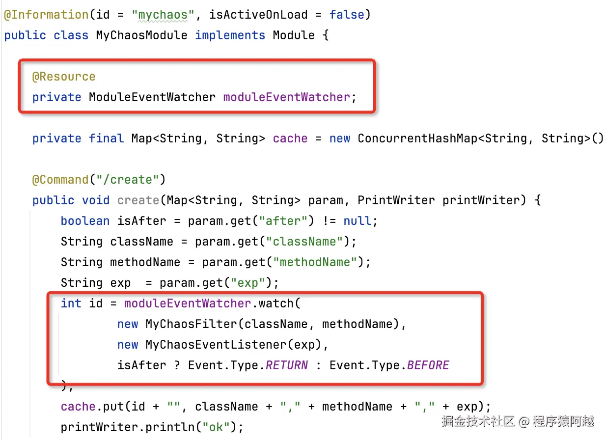 3)调用sandbox-api提供的ModuleEventWatcher,注册增强点监听,最后传入监听点(BEFORE-方法调用前、RETURN-方法执行后、THROWS-方法异常后),返回watchId