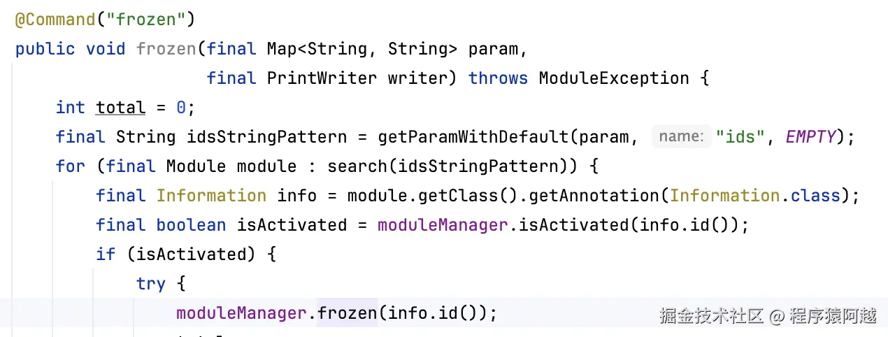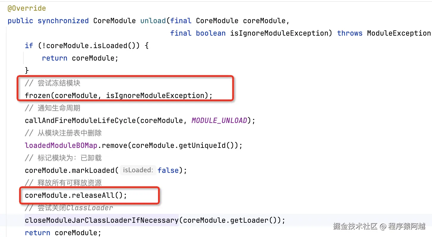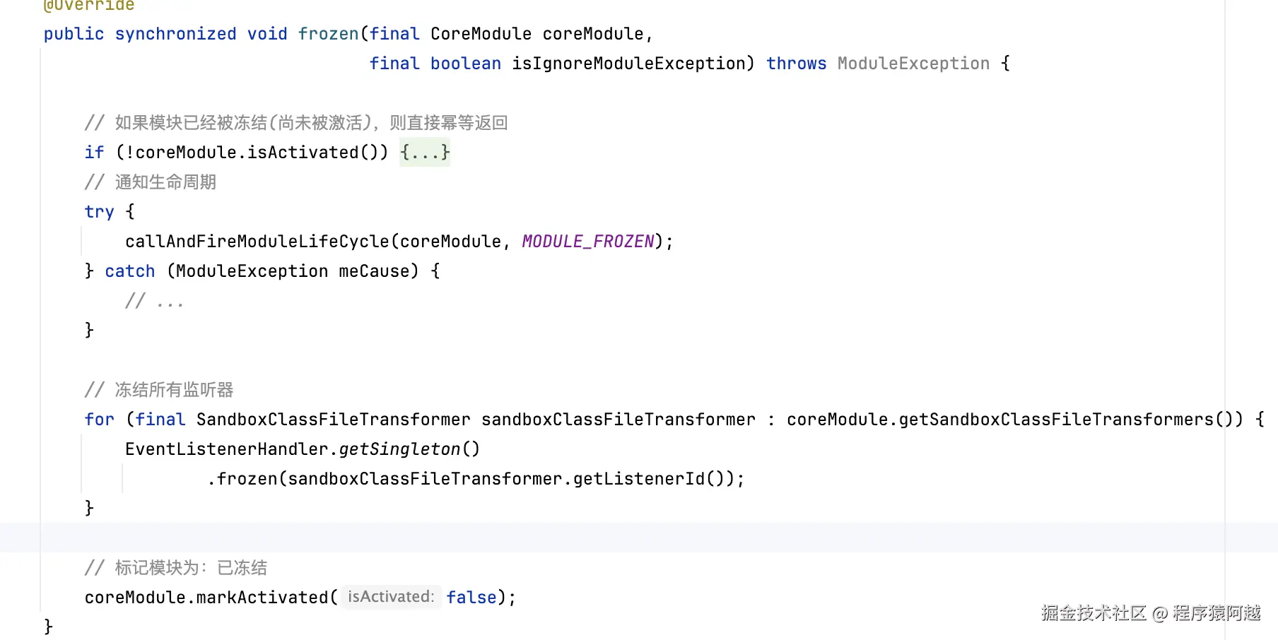 1)如果Module实现ModuleLifecycle,调用onFrozen方法;