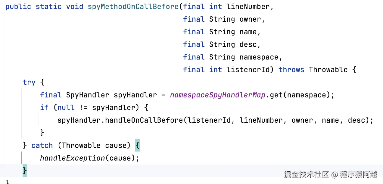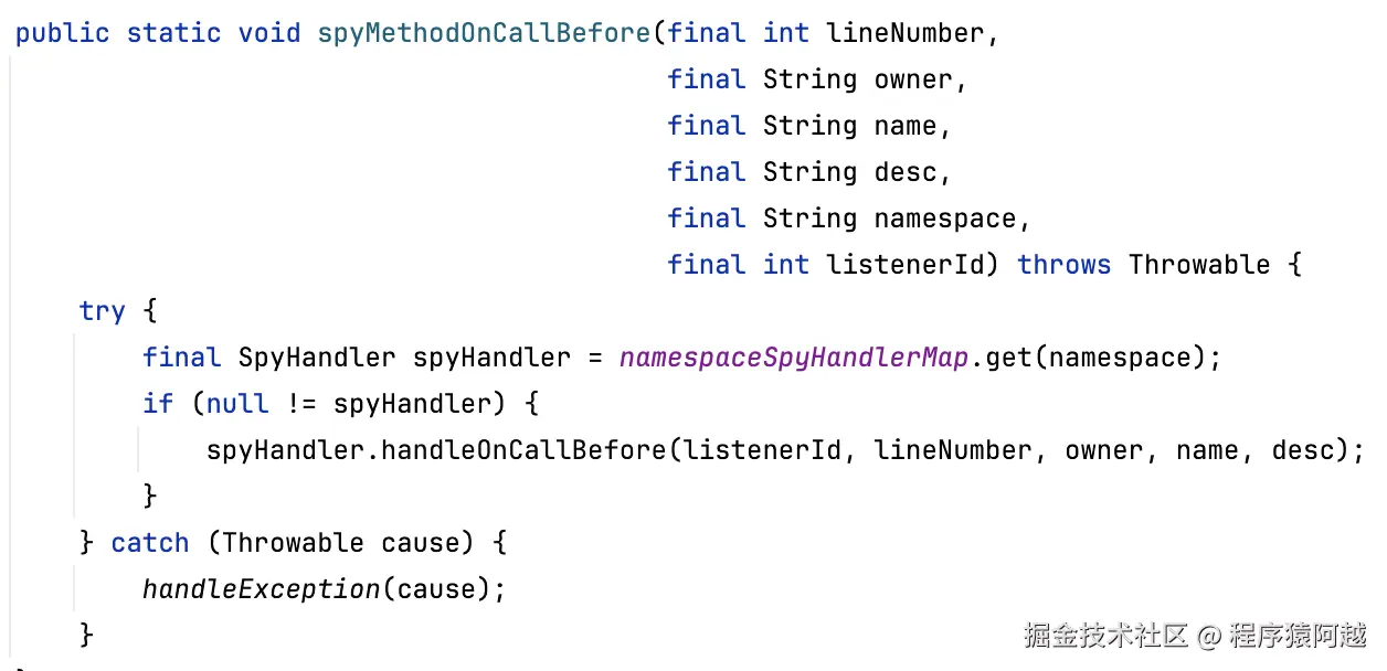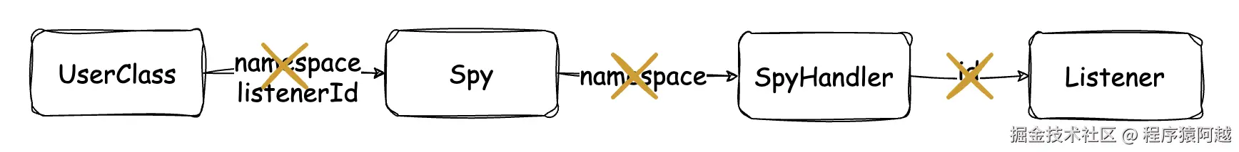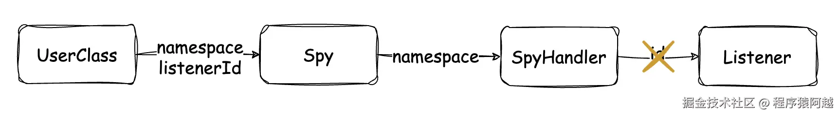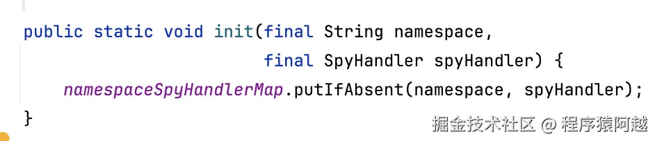2)Spy:静态map维护每个ns的SpyHandler实现,后续用户代码可以通过Spy进入插桩逻辑;