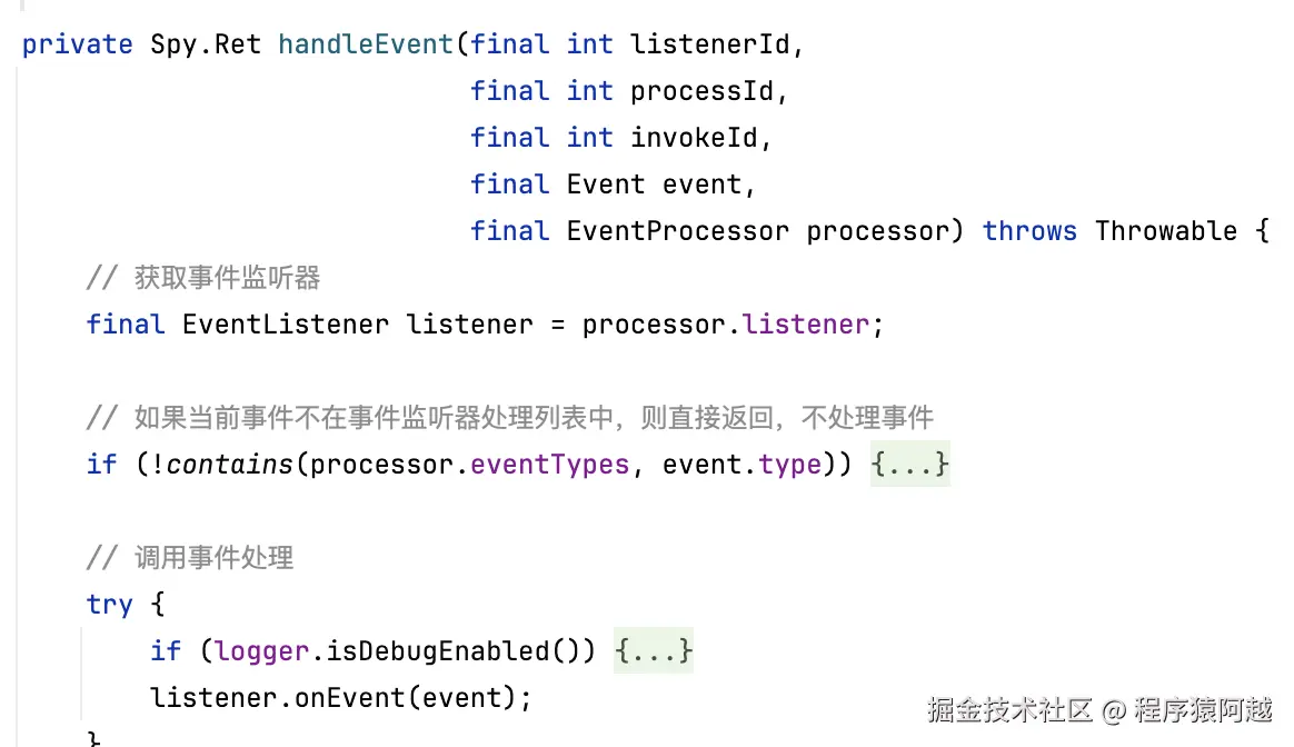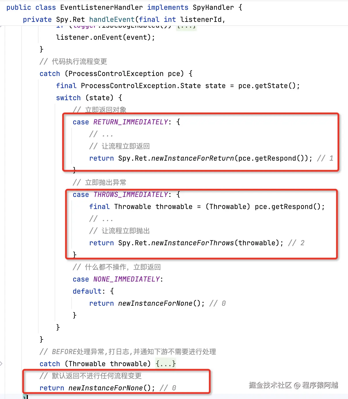 1)SpyHandler接口:定义before/return/throw的回调方法,每个ns会有一个SpyHandler实现(EventListenerHandler);