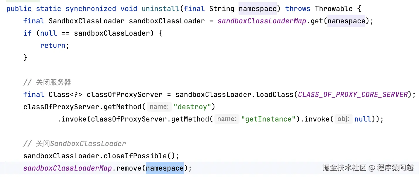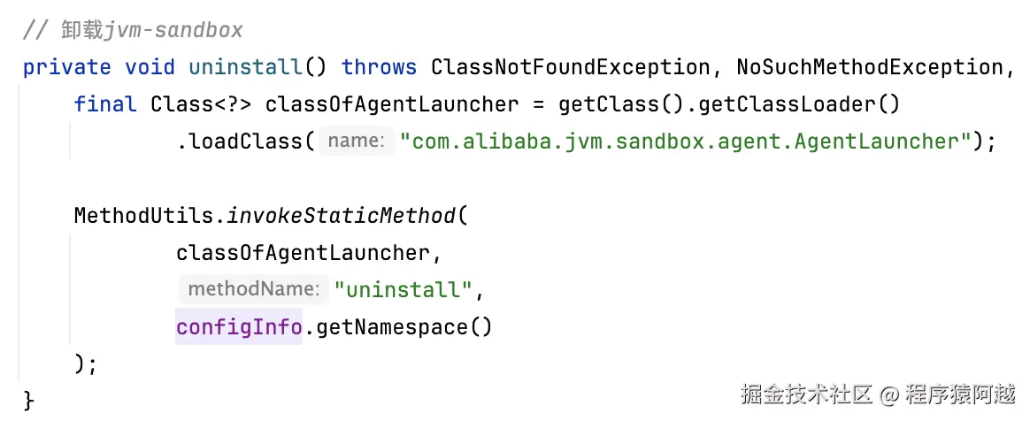 ControlModule#uninstall:使用sandbox-control模块的类加载器加载AgentLauncher(agent启动类),反射调用uninstall方法,卸载当前ns。