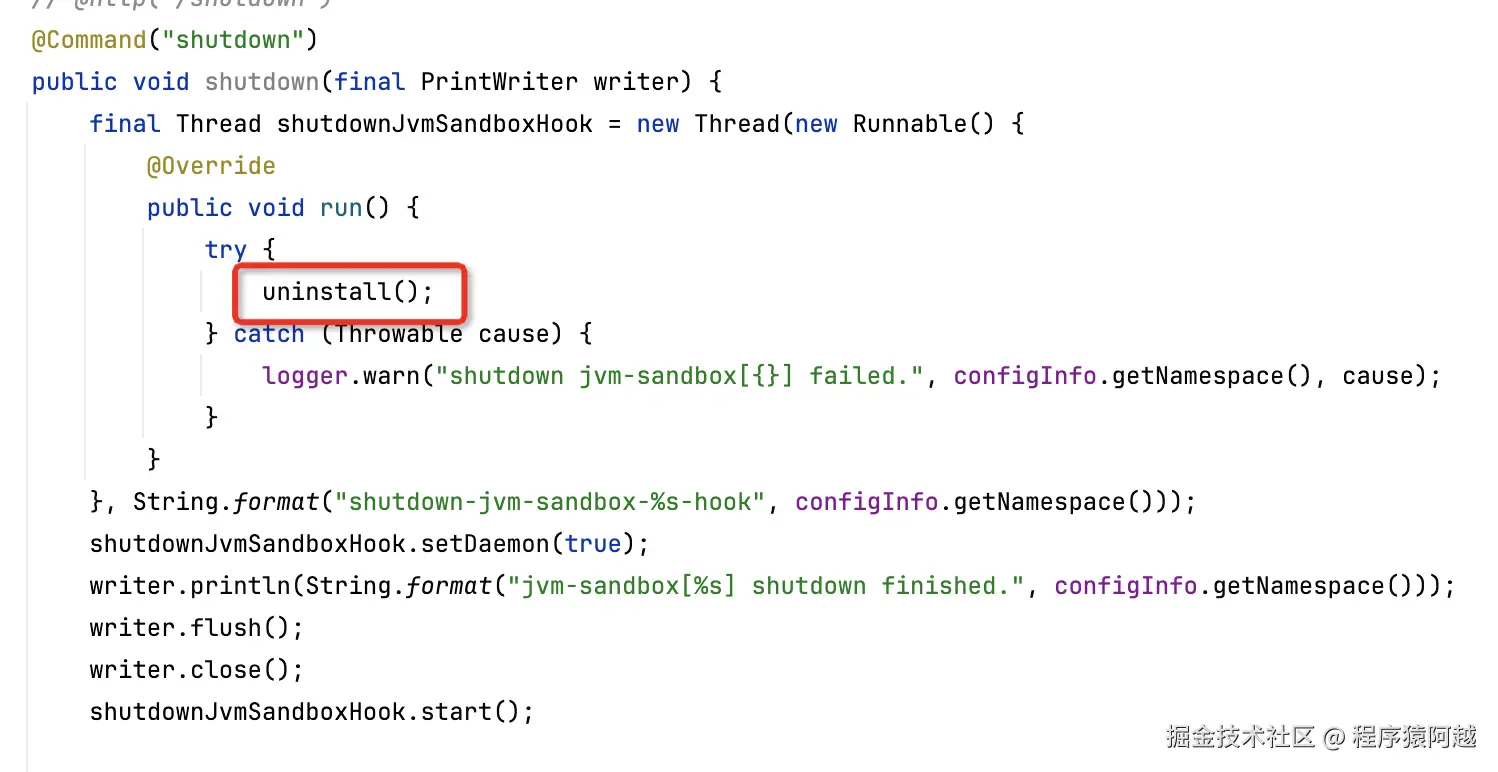 AgentLauncher#uninstall:通过ns下的SandboxClassLoader反射调用Http服务销毁,关闭SandboxClassLoader。