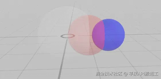 我们还是用三个小球来演示,在交错的情况下,不指定排序的话,默认情况是下图这样,部分轮廓会随着视角变化消失和出现: