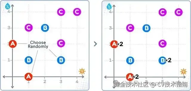 如上图所示,随机过采样会对少数类(A)中的样本进行随机复制(图中标记为A×2),而多数类(B和C)的样本保持不变。