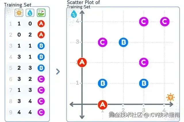 其中,每条记录包含三个字段:温度(取值范围0-3)、湿度(取值范围0-3)、高尔夫运动类型(A=标准场地,B=练习场,C=室内高尔夫)。整个训练集包含2个特征维度,共9条记录。