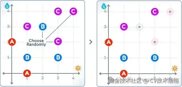 在上图所示的ENN欠采样结果中,右图中那些被红叉标记的多数类(B、C)样本被删除,因为它们的大部分邻居来自其他类别。