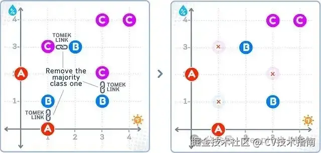 如上图所示,Tomek Links方法识别出不同类别(如A-B、B-C)之间的最近邻样本对,并删除这些样本对中来自多数类(B、C)的样本,而少数类(A)的样本全部保留。