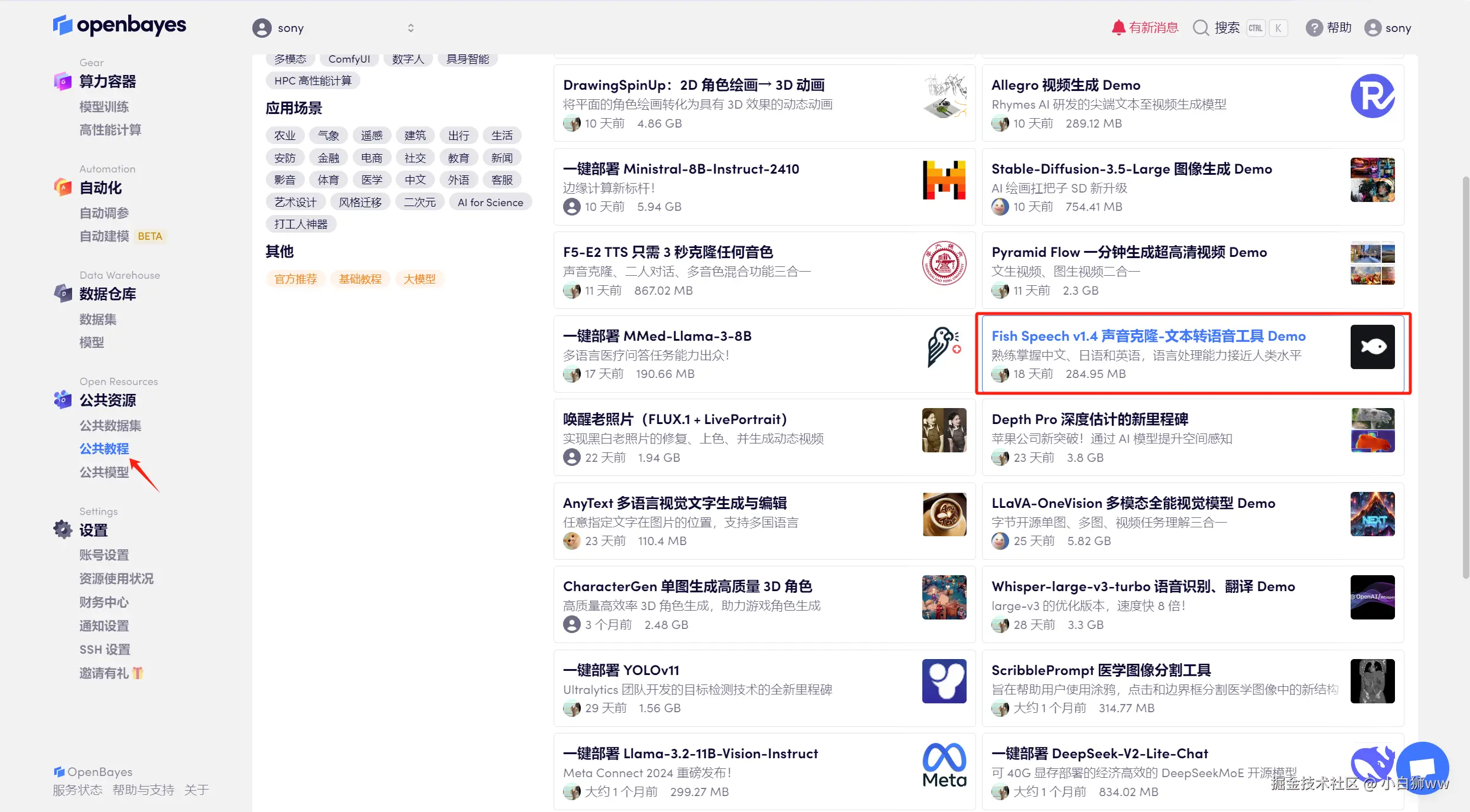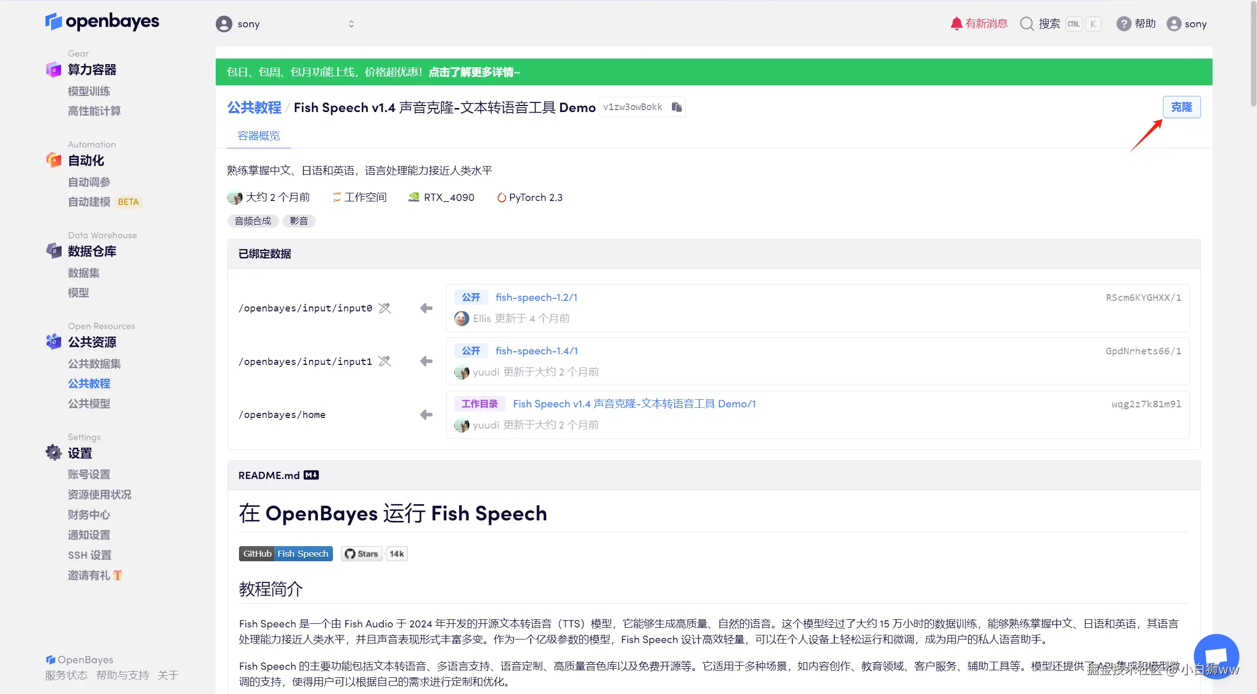 登录到 OpenBayes 平台后,打开「公共教程」,找到「Fish Speech v1.4 声音克隆-文本转语音工具 Demo」的教程。