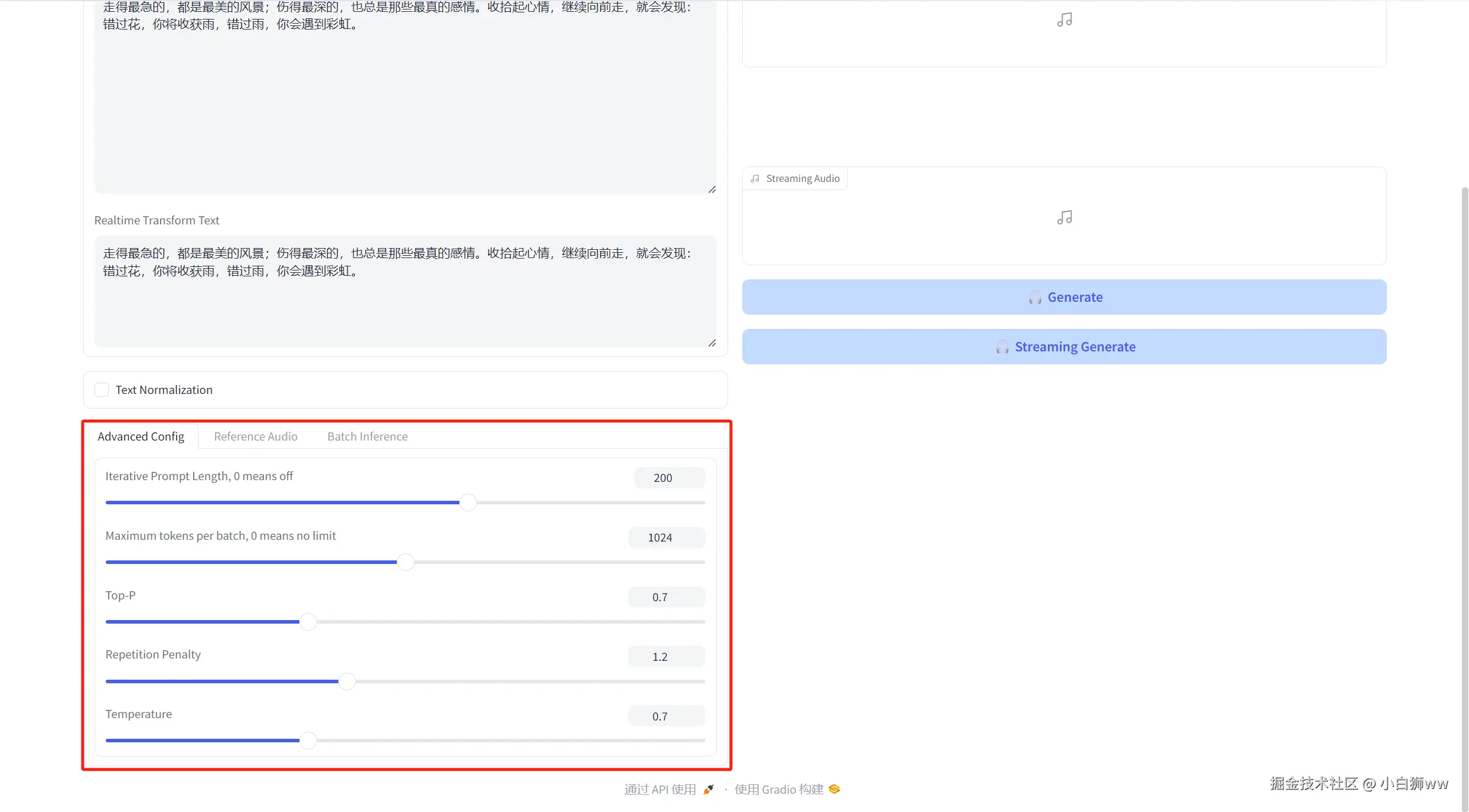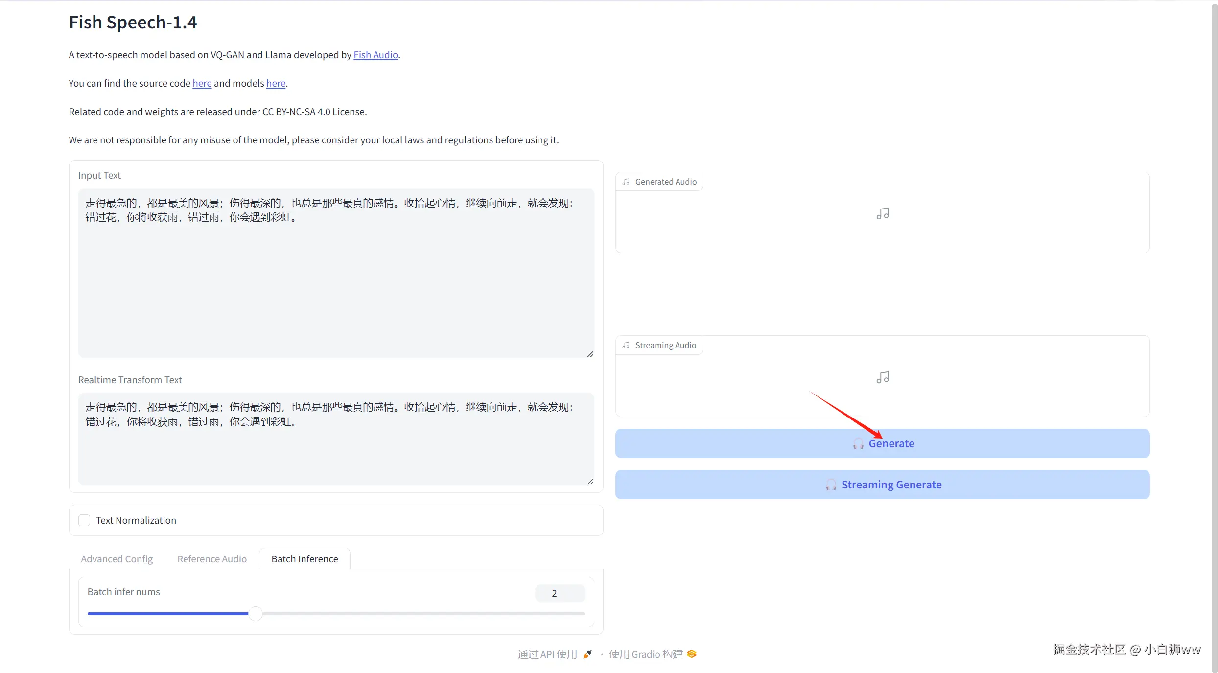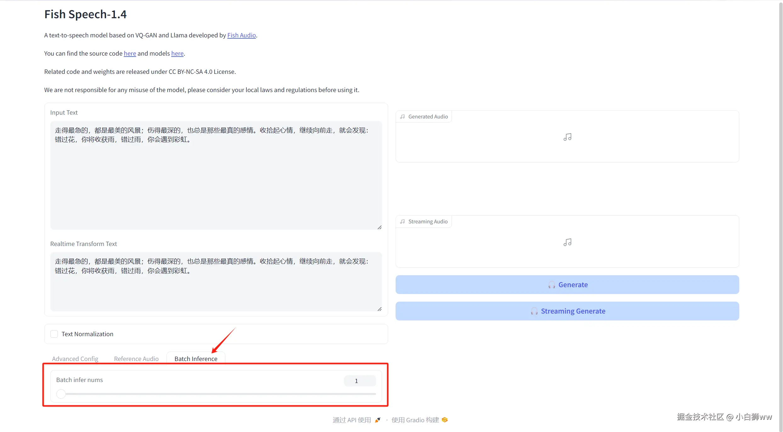 「Batch Inference」则表示生成语音的个数,默认值为「1」。