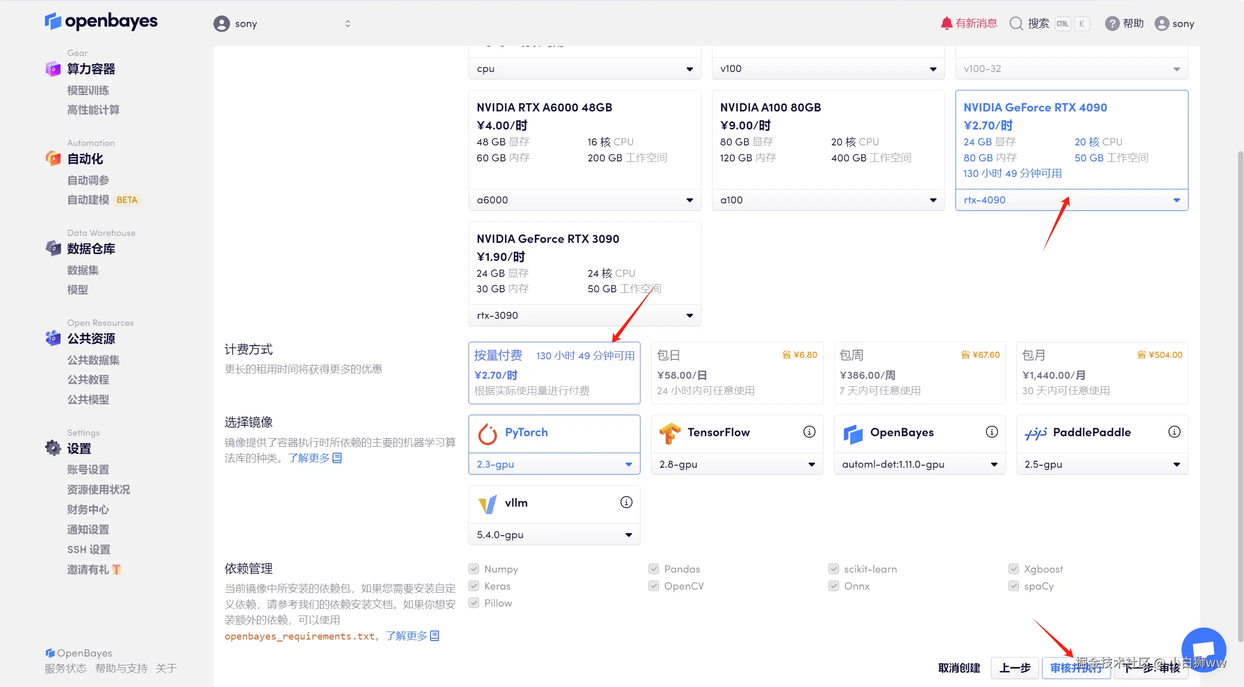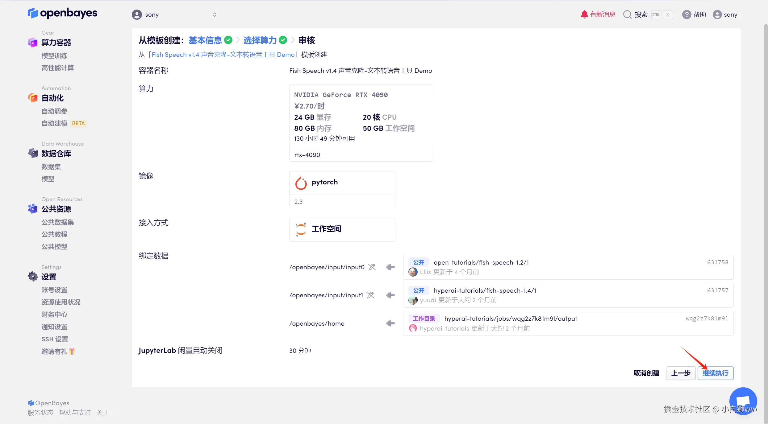 平台会自动选择合适的算力资源和镜像版本,这里使用的是英伟达 RTX 4090 的算力和 PyTorch 的镜像,点击「审核并执行」。可以使用文章开头的邀请链接,获得 RTX 4090 使用时长!