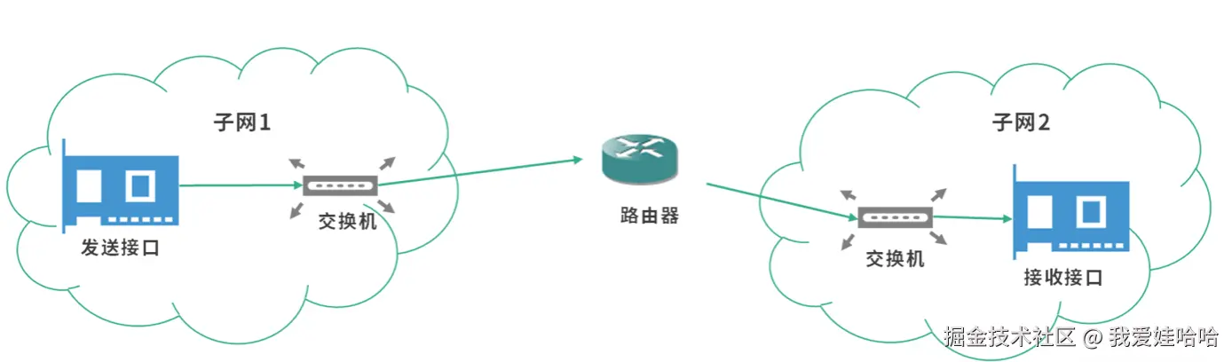 也就是说,图中的路由器,其实充当了两个子网通信的桥梁。在上述过程中,发送接口不能直接通过 MAC 地址发送数据到接收接口,因为子网 1 的交换机不知道子网 2 的接口。这个时候,发送接口需要通过 IP 协议,将数据发送到路由器,再由路由器转发信息到子网 2 的交换机。这里提一个问题,子网 2 的交换机如何根据 IP 地址找到接收接口呢?答案是通过查询 ARP 表。