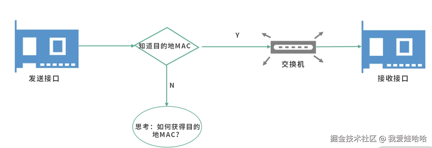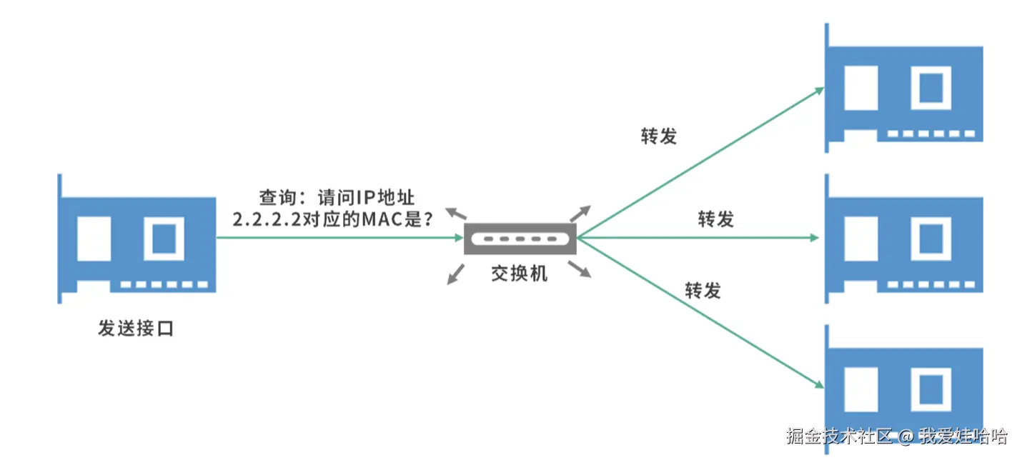 那么如果网络接口不知道目的地地址呢?这个时候,地址解析协议就开始工作了。发送接口会发送一个广播查询给到交换机,交换机将查询转发给所有接口。
