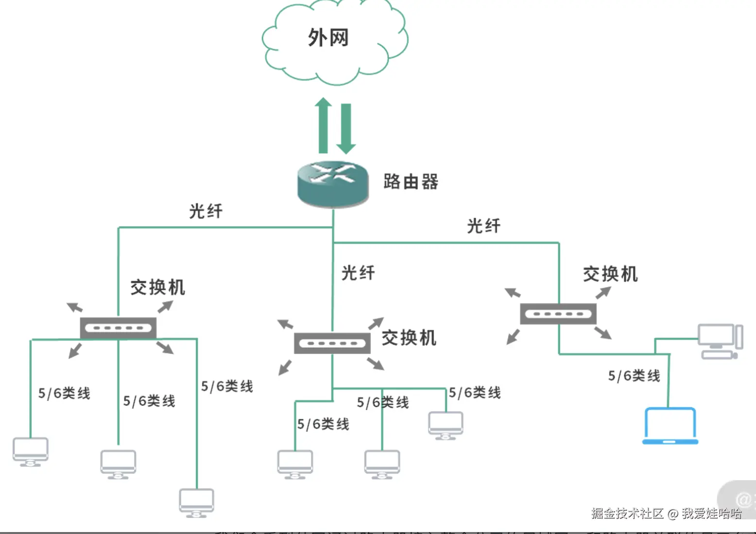 我们会看到外网通过路由器接入整个公司的局域网,和路由器关联的是三台交换机,代表公司的三个部门。交换机,或者称为链路层交换机,通常工作在链路层;而路由器通常也具有交换机的能力,工作在网络层和链路层。关于它们的详细区别,我们会在本文的后续讨论。