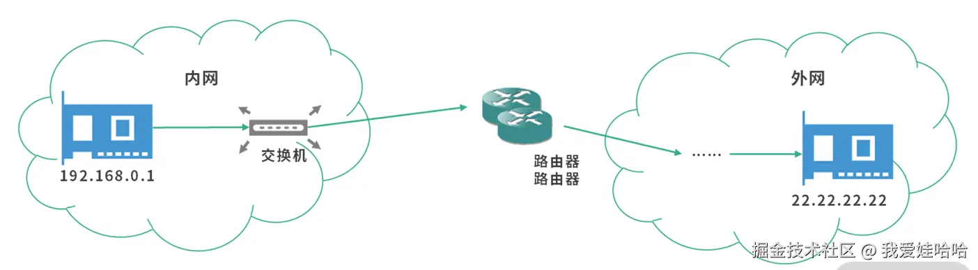 IPv4 协议因为存在网络地址耗尽的问题,不能为一个公司提供足够的地址,因此内网 IP 可能会和外网重复。比如内网 IP 地址192.168.0.1发送信息给22.22.22.22,这个时候,其实是跨着网络的。