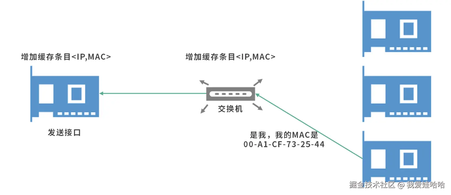 前面提到这个过程和 DNS 非常相似,采用的是逐级缓存的设计减少 ARP 请求。发送接口先查询本地的 ARP 表,如果本地没有数据,然后广播 ARP 查询。这个时候如果交换机中有数据,那么查询交换机的 ARP 表;如果交换机中没有数据,才去广播消息给其他接口。注意,ARP 表是一种缓存,也要考虑缓存的设计。通常缓存的设计要考虑缓存的失效时间、更新策略、数据结构等。