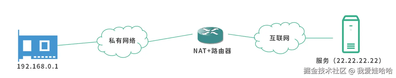 跨网络必然会通过多次路由,最终将消息转发到目的地。但是这里存在一个问题,寻找的目标 IP 地址22.22.22.22是一个公网 IP,可以通过正常的寻址 + 路由算法定位。当22.22.22.22寻找192.168.0.1的时候,是寻找一个私网 IP,这个时候是找不到的。解决方案就是网络地址转换技术(Network Address Translation)。