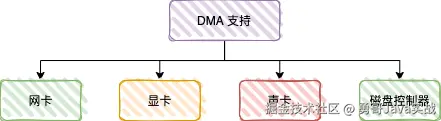 目前支持 DMA 的硬件包括:网卡、声卡、显卡、磁盘控制器等。