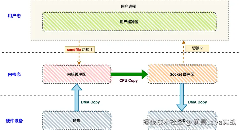 相比较于 mmap 内存映射的方式,sendfile 少了 2 次上下文切换,但是仍然有 1 次 CPU 拷贝操作。