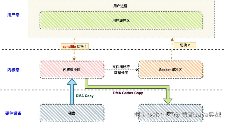 在硬件的支持下,sendfile 拷贝方式不再从内核缓冲区的数据拷贝到 socket 缓冲区,取而代之的仅仅是缓冲区文件描述符和数据长度的拷贝,这样 DMA 引擎直接利用 gather 操作将页缓存中数据打包发送到网络中即可,本质就是和虚拟内存映射的思路类似。