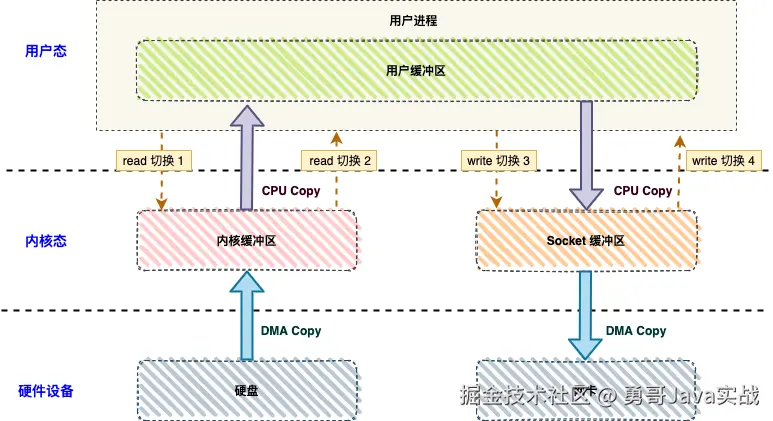 Linux 系统中,传统的访问方式是通过 write() 和 read() 两个系统调用实现的,通过 read() 函数读取文件到到缓存区中,然后通过 write() 方法把缓存中的数据输出到网络端口 。